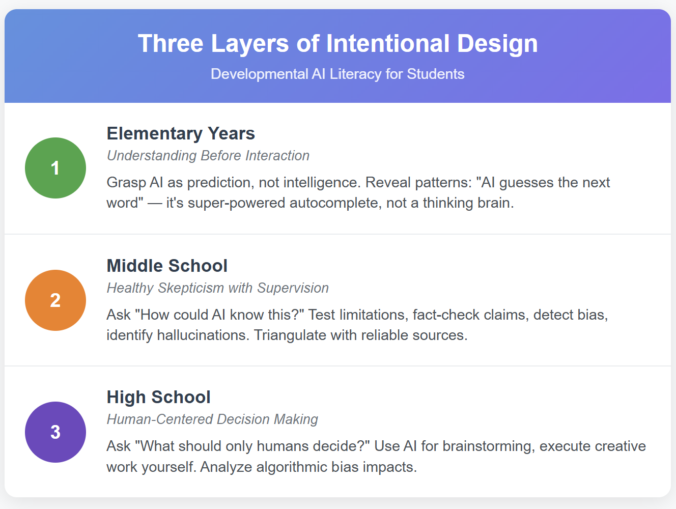 Rather than banning AI interactive spaces or deploying them as designed, educators can choose a third path: intentional, literacy-focused implementation. This requires thinking developmentally about what students need at different stages.