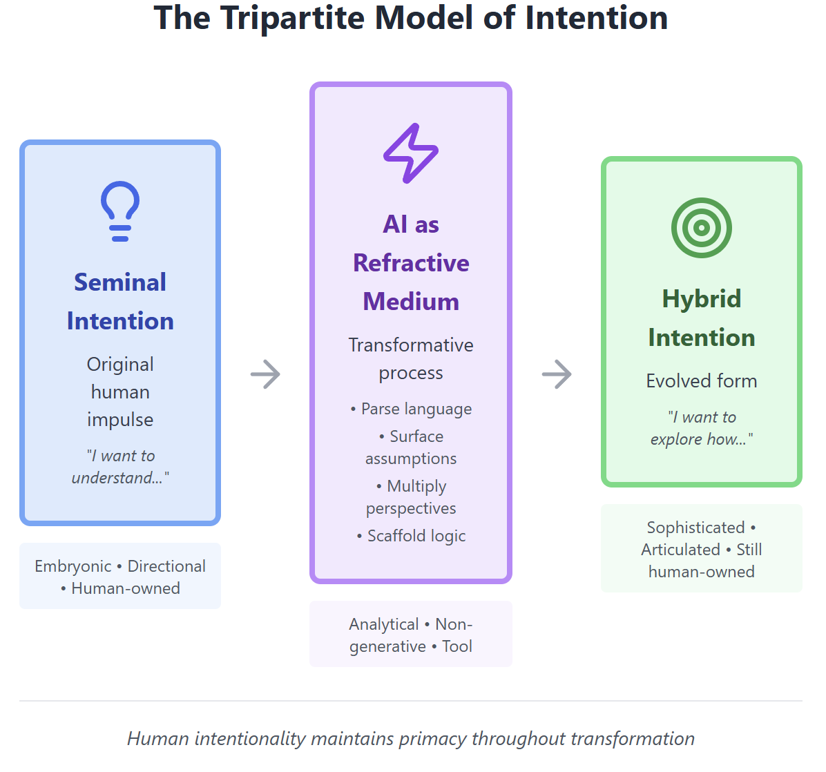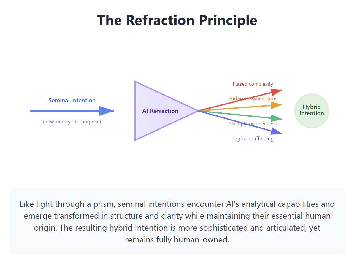 The complete tripartite model reveals a dynamic process where human intentionality maintains primacy throughout transformation. Seminal intentions provide the motivational energy and directional purpose. AI refraction serves as the analytical medium that reveals complexities, surfaces assumptions, and multiplies perspectives. Hybrid intentions emerge as enhanced versions of the original human purposes—more sophisticated, better articulated, and strategically developed, yet retaining complete human ownership and control.