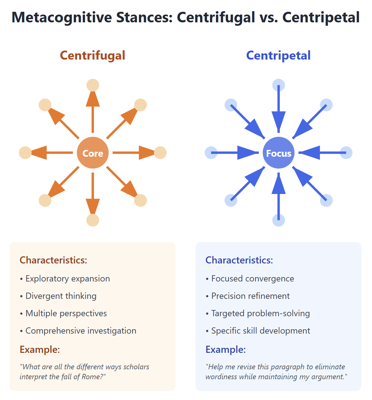 Metacognitive inversion describes the learner’s deliberate choice to adopt either a centripetal or centrifugal stance toward AI interaction, based on the nature of their hybrid intention and learning goals. This inversion is fundamentally metalinguistic—it involves conscious decisions about how to structure the language of inquiry itself. The learner must decide whether their hybrid intention calls for a binary stance, convergent focusing (centripetal) or divergent exploration (centrifugal), or a mixed stance. Once this instrumental intention is clarified, learners can start to design a strategy for a chat. Of course, the instrumental strategy is subject to ongoing revisions the chat unfolds.